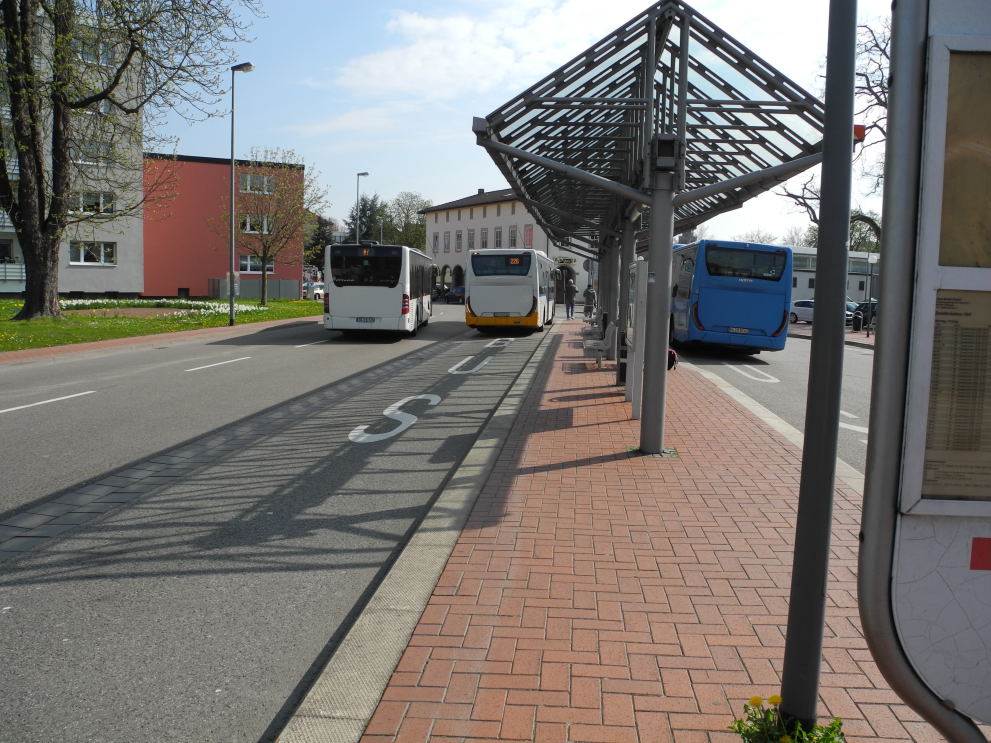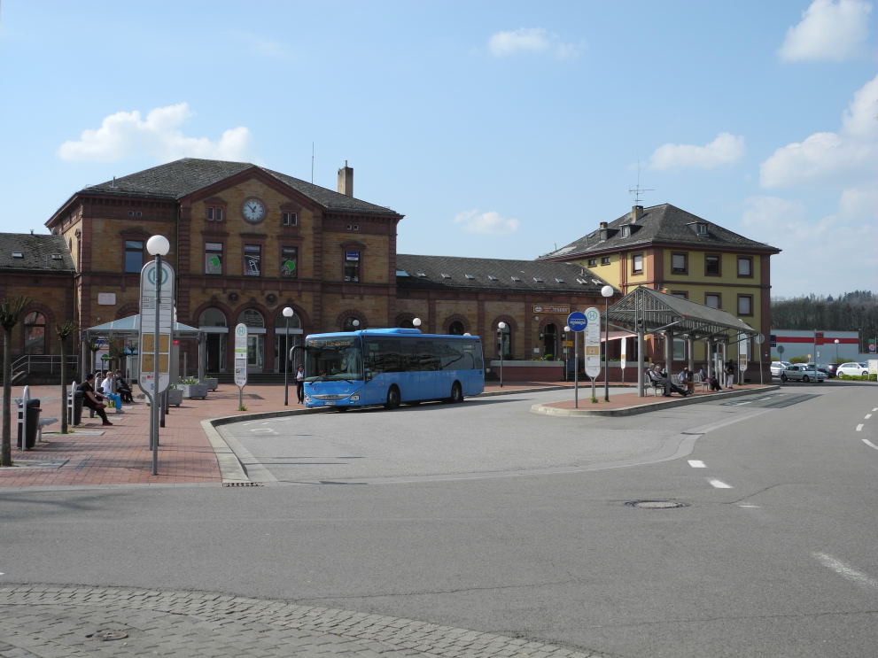 Vor dem Bahnhofsgebäude befinden sich verschiedene Bushaltestellen. Noch die Verbindungen in den Abendstunden relativ spärlich. Mit der Inbetriebnahme der S-Bahn müsste das Busliniennetz in Zweibrücken angepasst werden. Es ist ein Vorteil des Busses, dass die Linienführung leicht geändert werden kann.