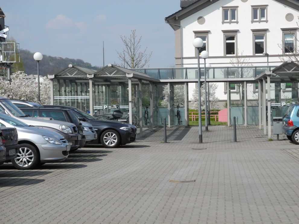 Neben dem Bahnhofsgebäude gibt es eine große überdachte Fahrradabstellanlage.