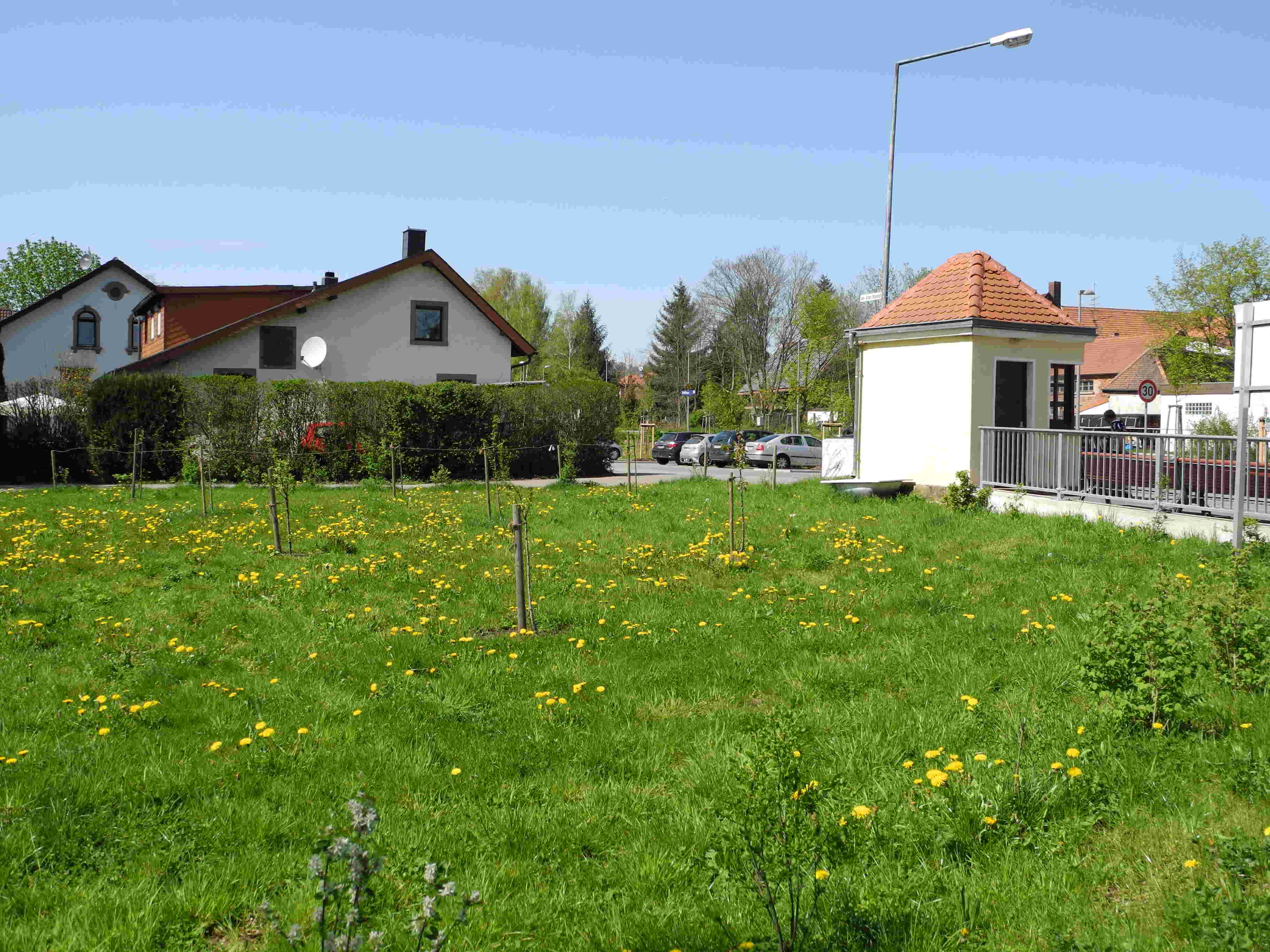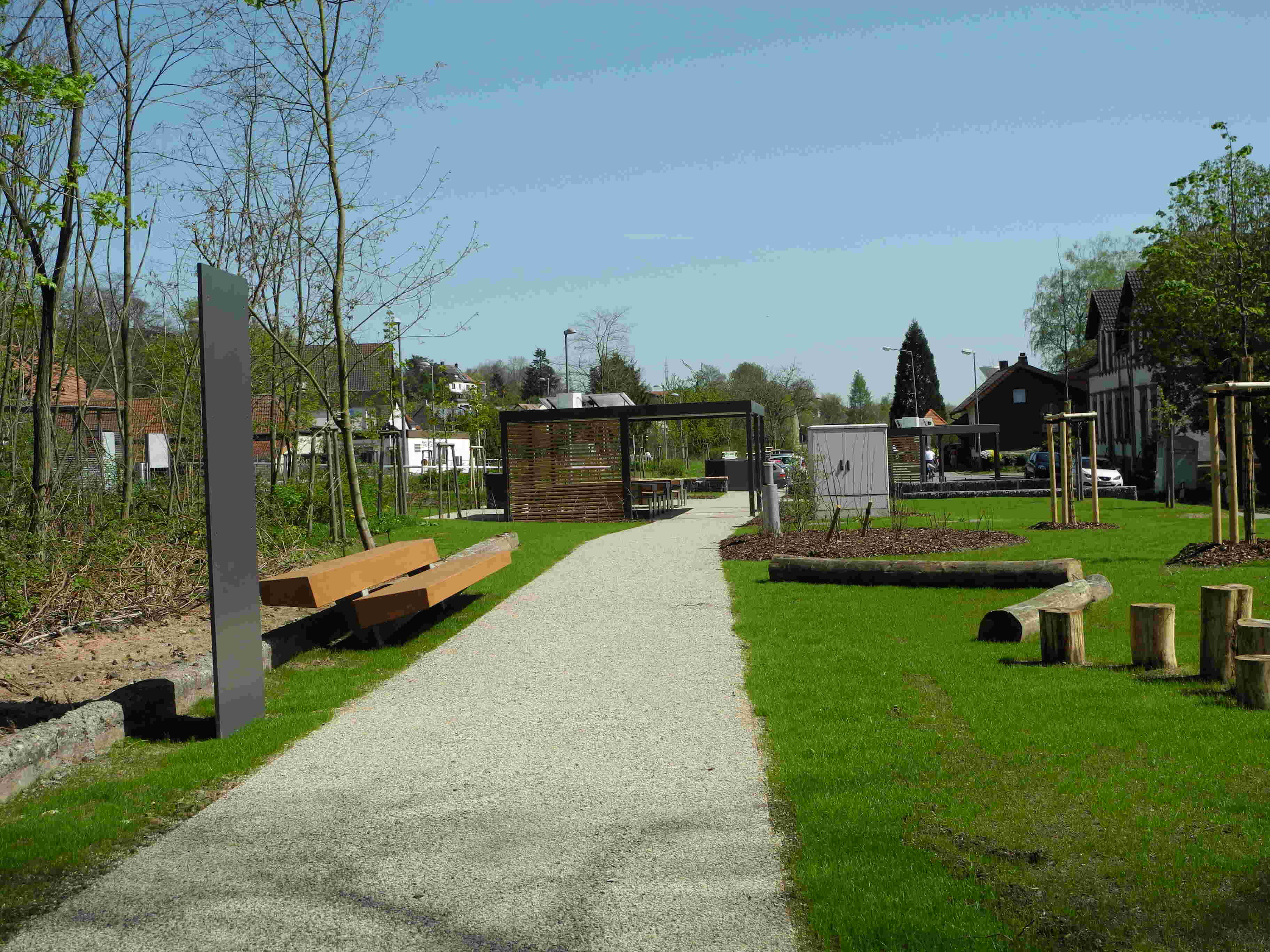 Unten: Kiesweg mit (noch) leerer Infotafel, Holzbett (?), Spielplatz | Weiter Richtung Ingweiler