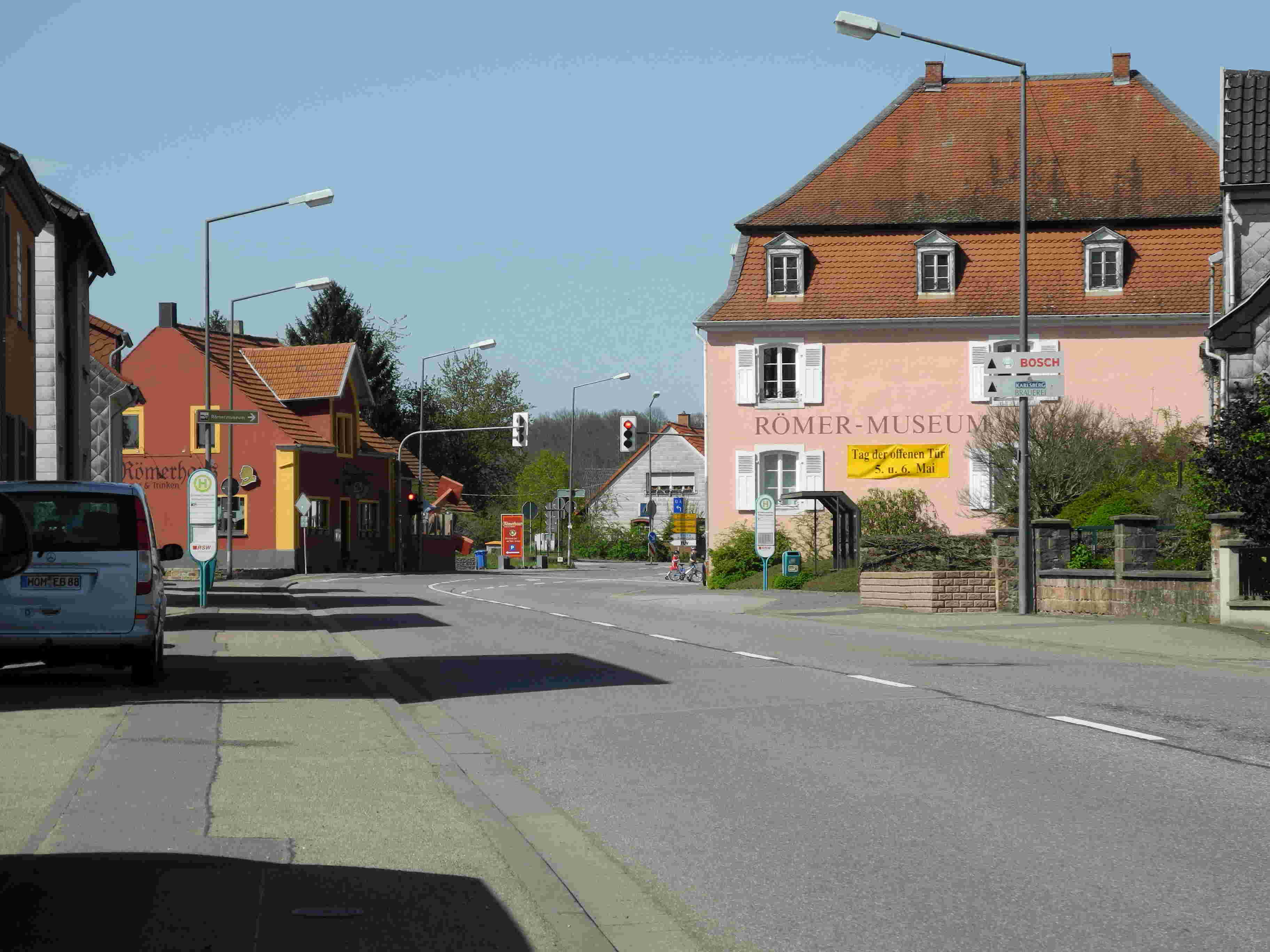 Schwarzenacker: Homburger Straße mit Römerhaus (links) und Edelhaus mit Römermuseum (rechts)