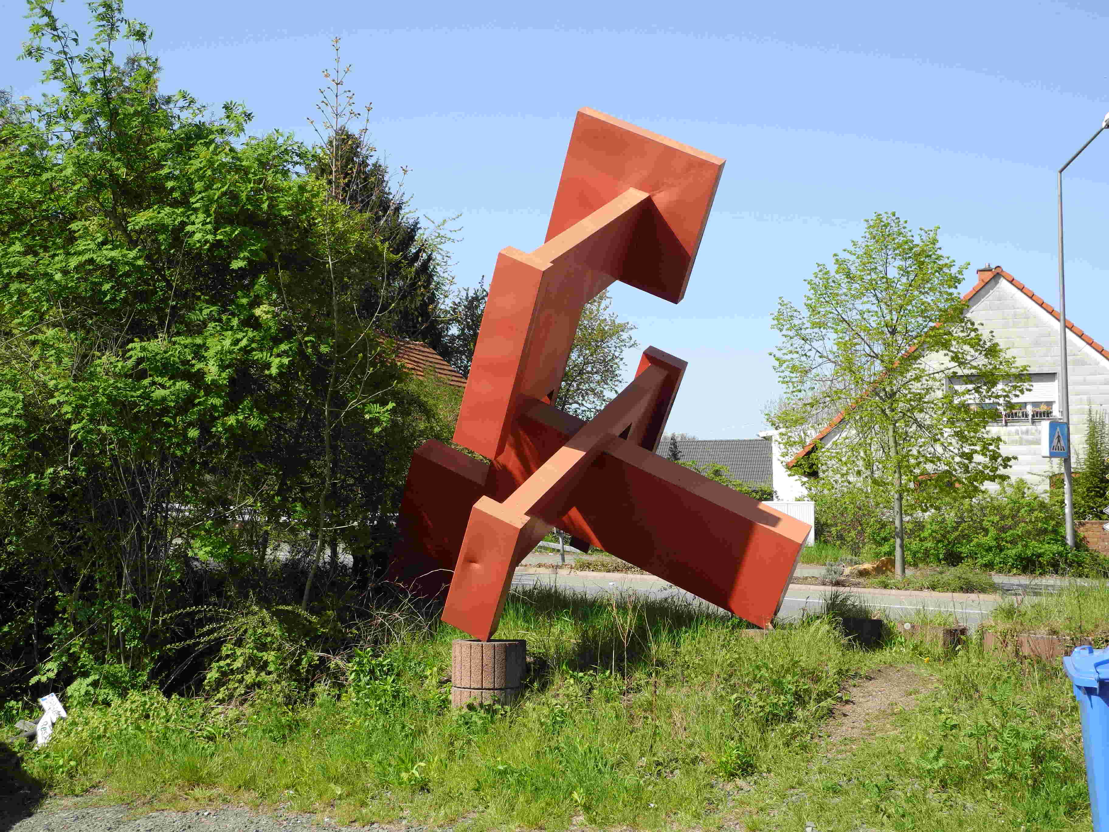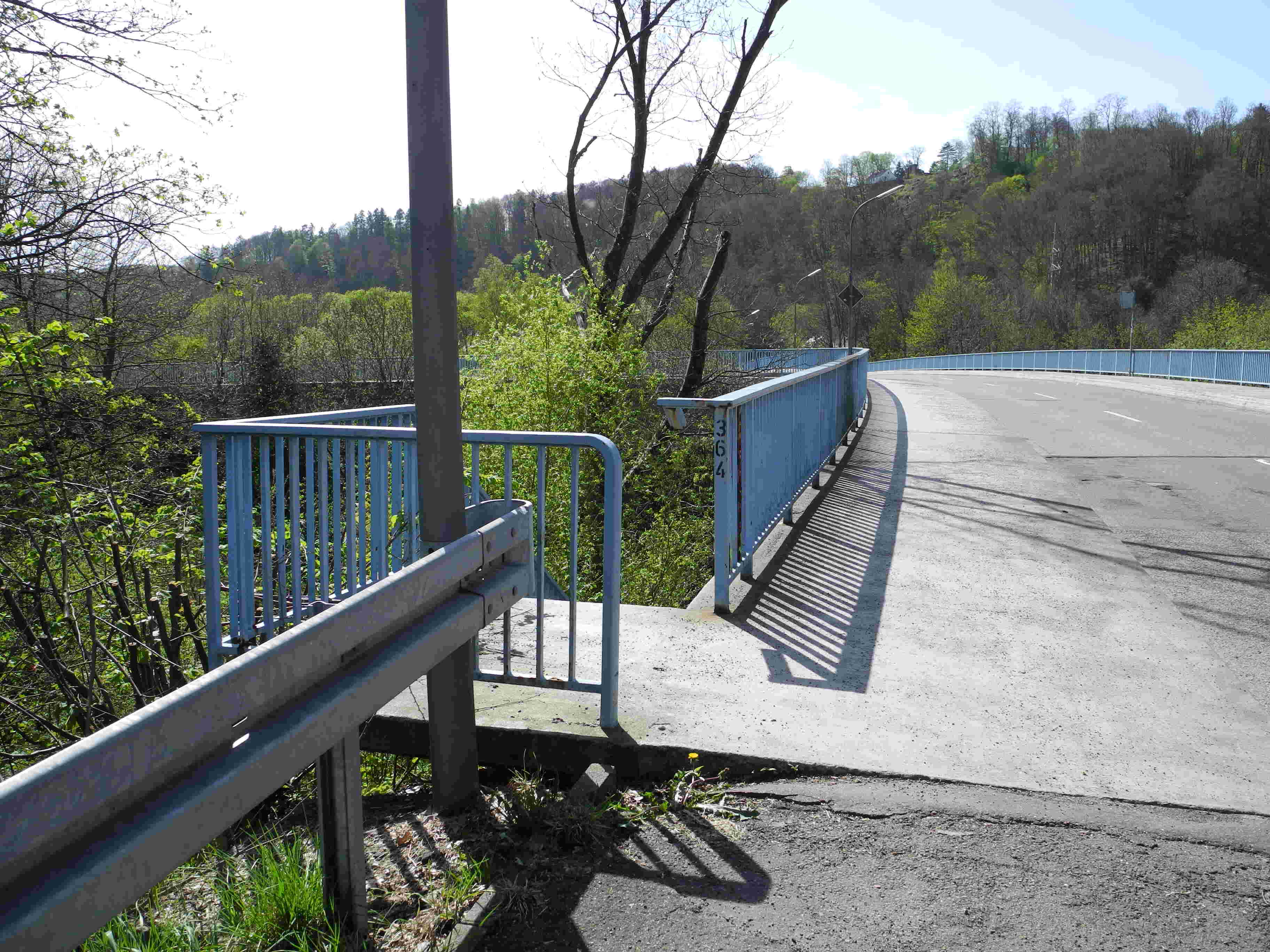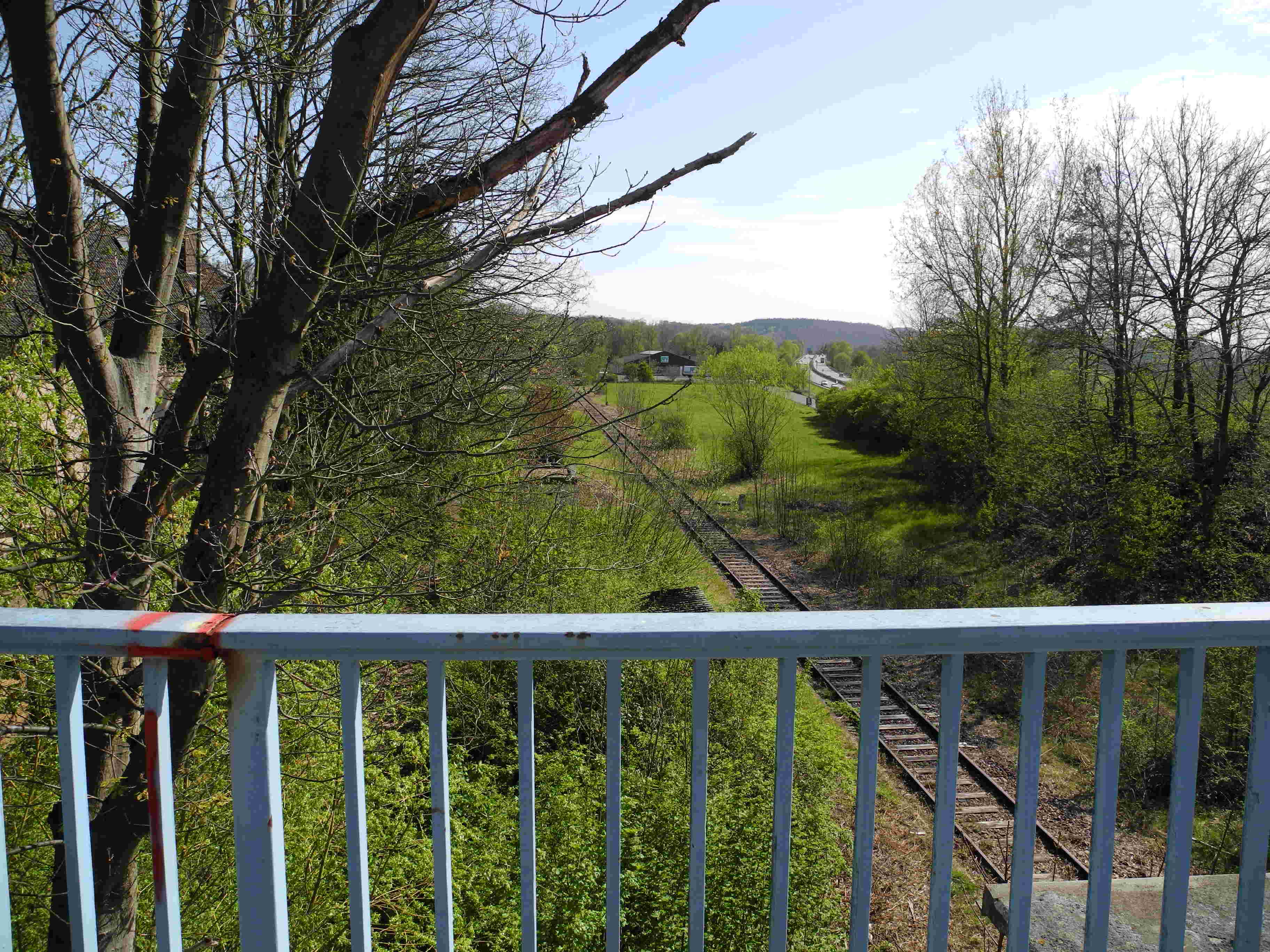 Brücke Richtung Wörschweiler: Treppe zum Bahnsteig, Blick auf das Gleis | Skulptur von L. Netz-Paulik