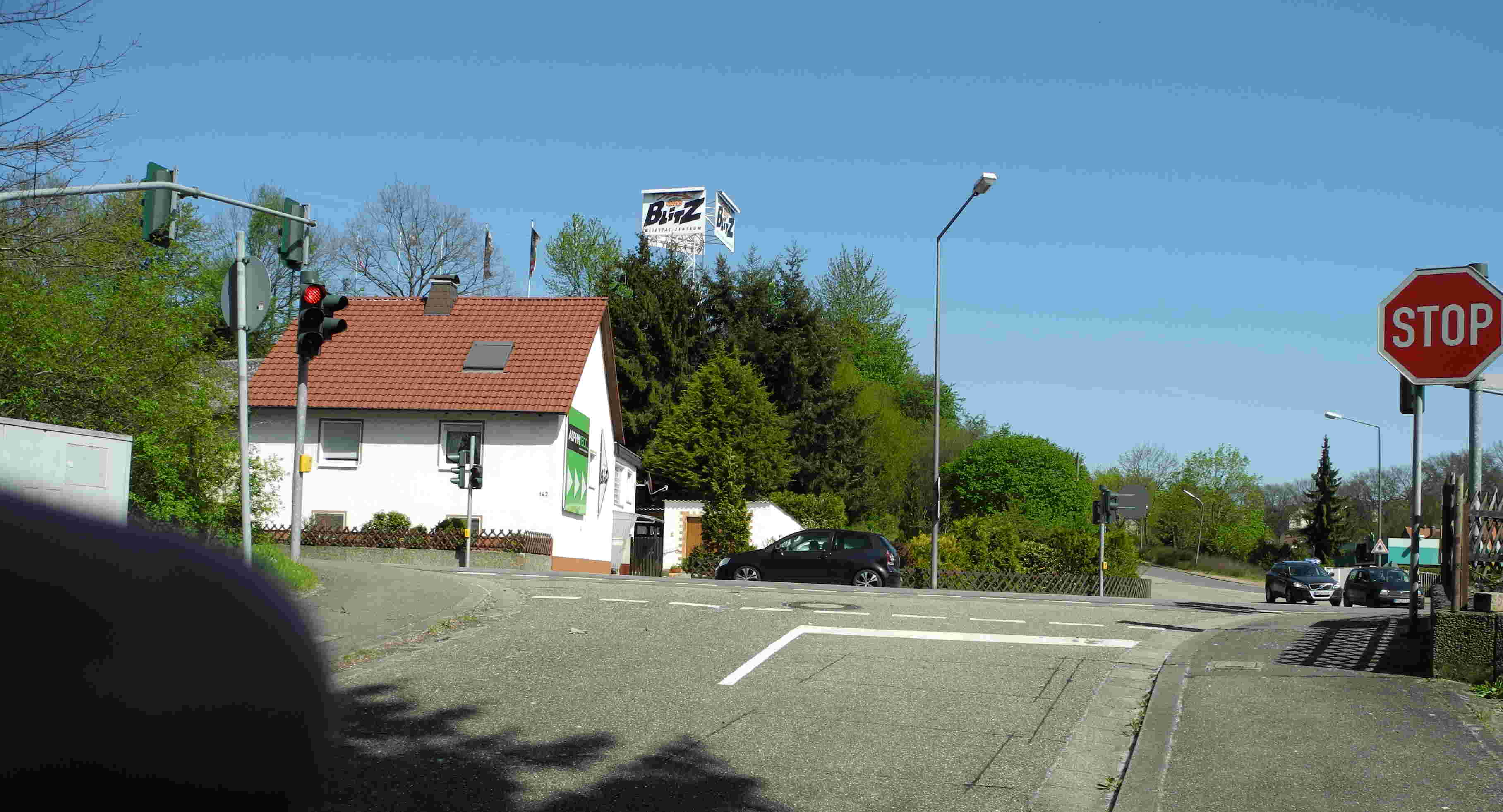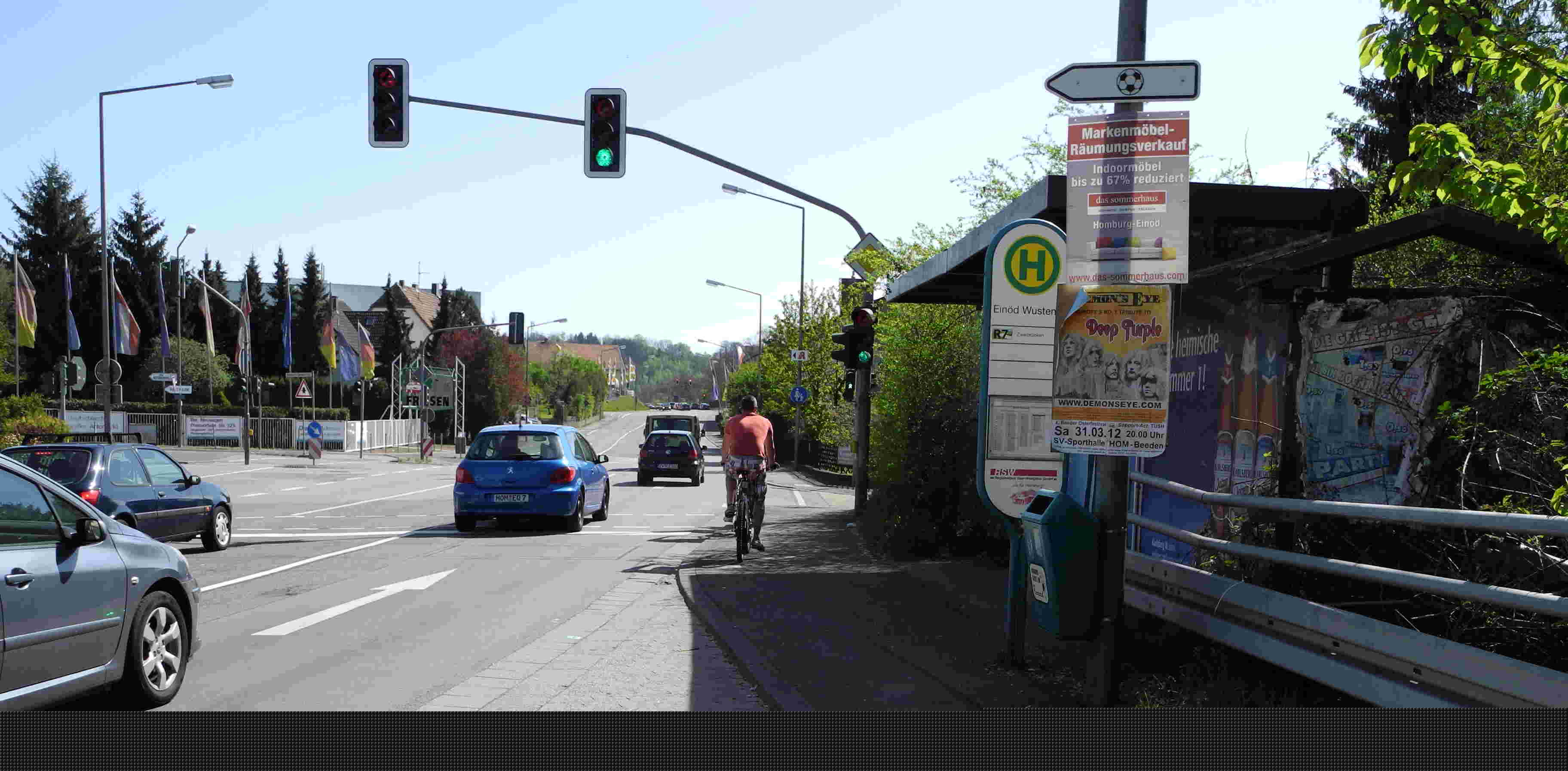 Rechts Einmündung der Kieskautstraße in die Homburger Straße | Kommt man von Schwarzenacker, muss man an der Ampel gleich hinter der Haltestelle "Einöd Wustental" nach rechts abbiegen. | Eine gute Umgehung der B 423 Richtung Einöd, aber schlecht zu finden. Ein Schild wäre hier hilfreich.
