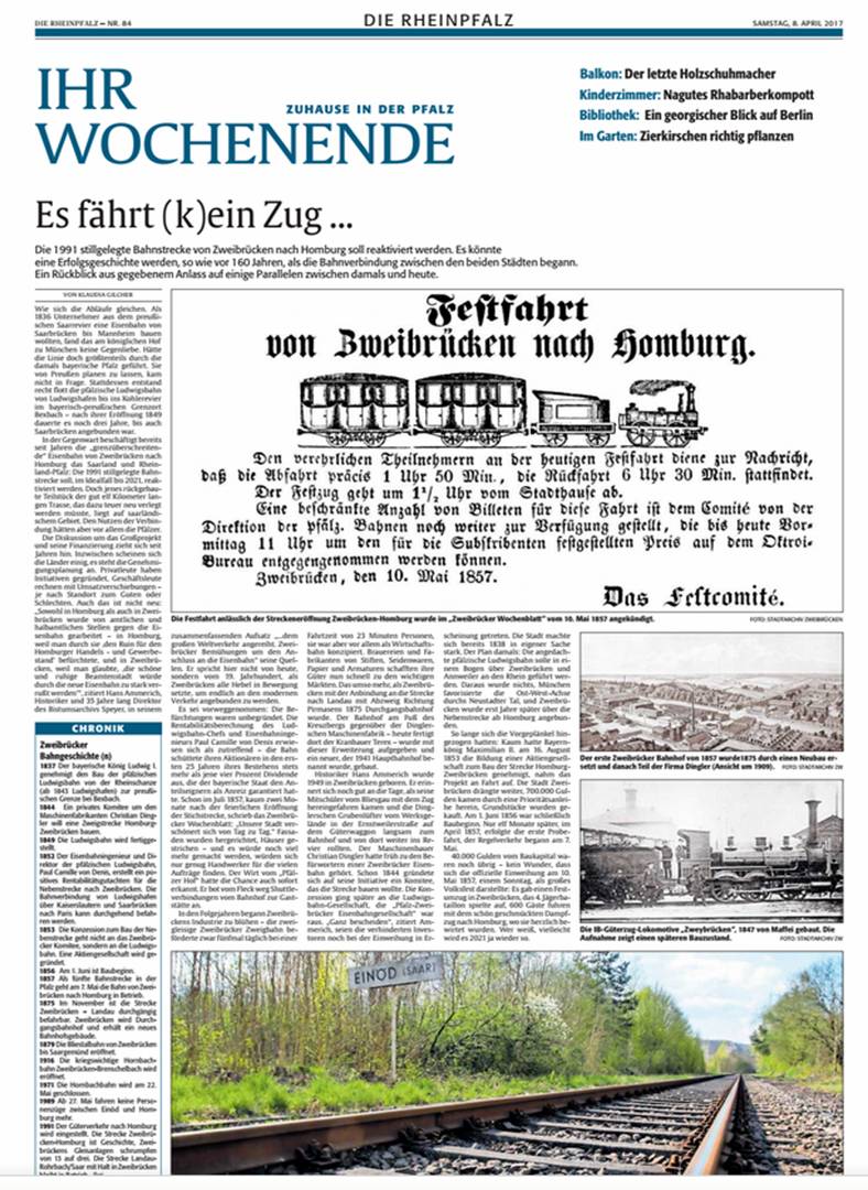 Die Diskussion um das Großprojekt und seine Finanzierung zieht sich seit Jahren hin. Inzwischen scheinen sich die Länder einig, es steht die Genehmigungsplanung an. Privatleute haben Initiativen gegründet, Geschäftsleute rechnen mit Umsatzverschiebungen – je nach Standort zum Guten oder Schlechten. Auch das ist nicht neu: „Sowohl in Homburg als auch in Zweibrücken wurde von amtlichen und halbamtlichen Stellen gegen die Eisenbahn gearbeitet – in Homburg, weil man durch sie ,den Ruin für den Homburger Handels - und Gewerbestand’ befürchtete, und in Zweibrücken, weil man glaubte, ,die schöne und ruhige Beamtenstadt würde durch die neue Eisenbahn zu stark verrußt werden'“, zitiert Hans Ammerich, Historiker und 35 Jahre lang Direktor des Bistumsarchivs Speyer, in seinem zusammenfassenden Aufsatz „...dem großen Weltverkehr angereiht. Zweibrücker Bemühungen um den Anschluss an die Eisenbahn“ seine Quellen. Er spricht hier nicht von heute, sondern vom 19. Jahrhundert, als Zweibrücken alle Hebel in Bewegung setzte, um endlich an den modernen Verkehr angebunden zu werden.