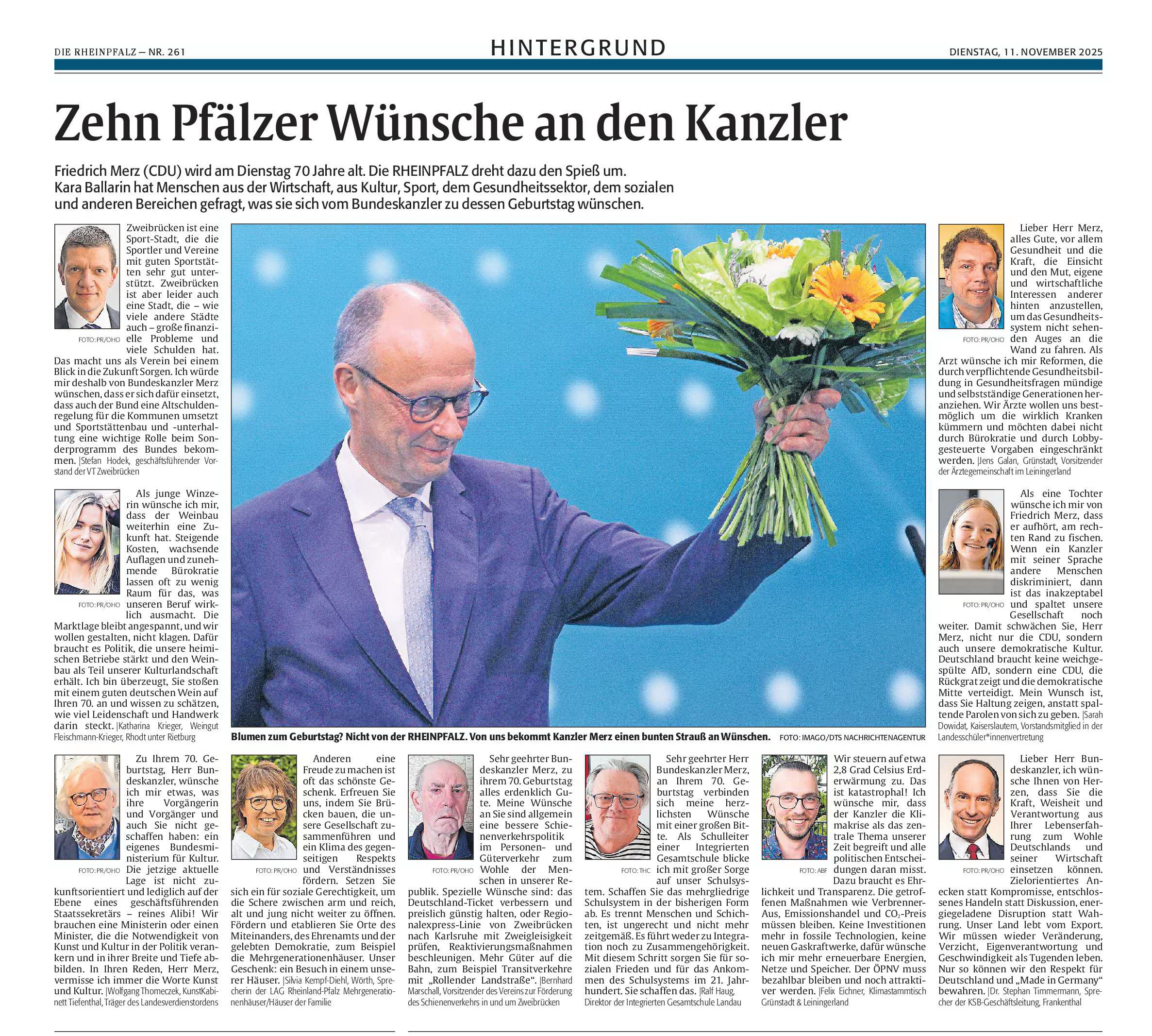 Sehr geehrter Bundeskanzler Merz, zu ihrem 70. Geburtstag alles erdenklich Gute. Meine Wünsche an Sie sind allgemein eine bessere Schienenverkehrspolitik im Personen- und Güterverkehr zum Wohle der Menschen in unserer Republik. Spezielle Wünsche sind: das Deutschland-Ticket verbessern und preislich günstig halten, oder Regionalexpress-Linie von Zweibrücken nach Karlsruhe mit Zweigleisigkeit prüfen, Reaktivierungsmaßnahmen beschleunigen. Mehr Güter auf die Bahn, zum Beispiel Transitverkehre mit „Rollender Landstraße“.Bernhard Marschall, Vorsitzender des Vereins zur Förderung des Schienenverkehrs in und um Zweibrücken
